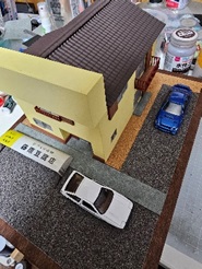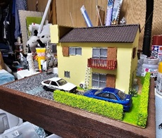 その後、アルミサッシやドア、雨戸やベランダやら玄関とかプラ棒を組んで半透明プラ板を貼りながら作って行きます。よくよく考えたらミニカーの据え物なのに凝り過ぎた感もありますが、売られた喧嘩は必ず買えと亡くなったばぁちゃんから言われていましたので、地道に作業を進めます。 外壁塗装用のペンキを塗って全体的なバランスを確認します。