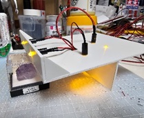 内側に全てアルミテープを貼って、内側の光が窓以外からは漏れないようにしてみます。そして点灯実験を重ねて昭和のお店の雰囲気が出てきました。しっかり光る位置を固定するために、LEDを配置するブラケットを製作しました。 看板内部を蛍光灯のように光らせたいと思い、半透明のプラ棒を内部に組み込み、LEDの粒が分からないように改造していきます。