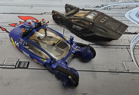 劇中車のデザインは変態デザインの第一人者(失礼)故シド・ミード氏が担当していました。(あのターンAガンダムもデザインした世界的に有名な工業デザイナー)走行も飛行も可能な架空車両です。デザインはやはり、普通の人では思いつかない形状をしています。